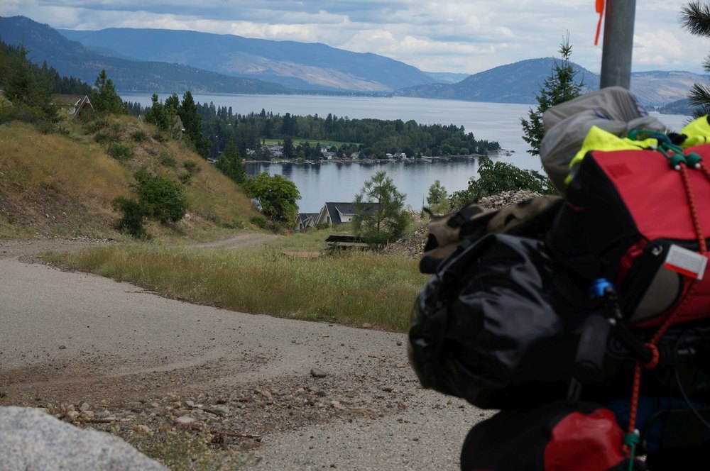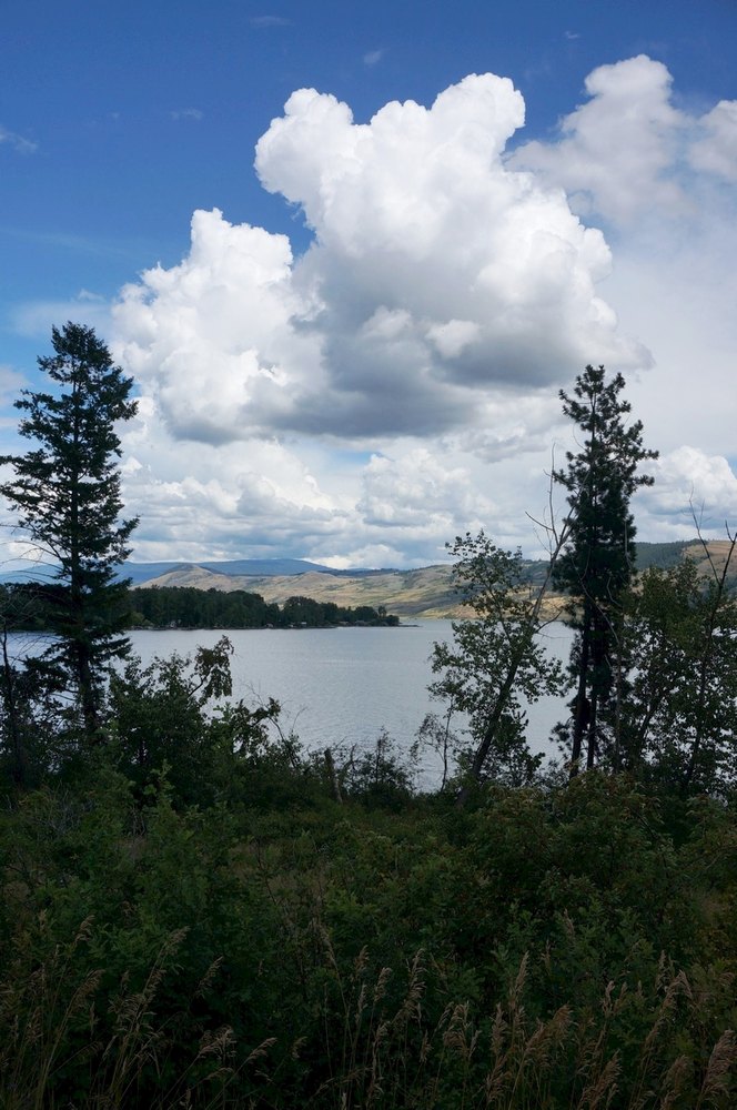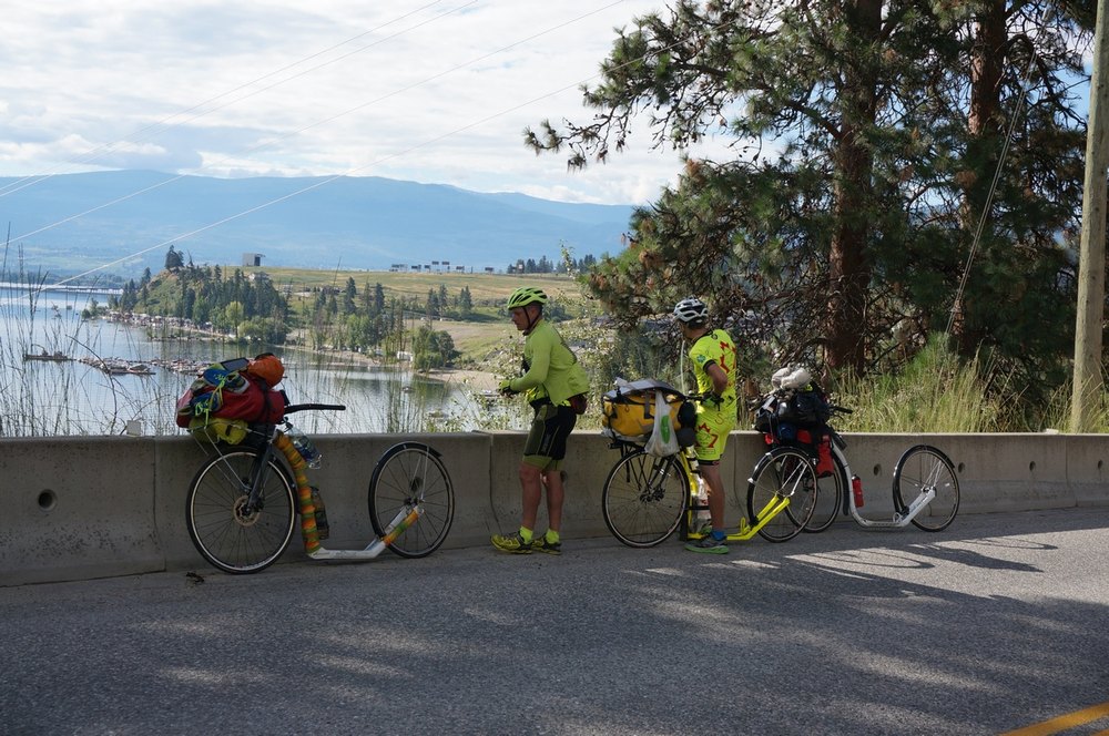 Sehr bald machten wir unsere erste Pause. Das war mir echt wichtig, denn es war das mein Frühstück. Die zweite Pause ließ sehr lange auf sich warten. Josef fuhr vor mir und schlug eine Pause vor. Ich meinte, diese sollte in der nächsten halben Stunde sein. Josef blieb aber nicht und nicht stehen und er war bereits außer Hörweite. Frederic war noc weiter hinter mir als Josef vor mir war. Also musste ich kicken und kicken bis irgendwo Josef stehen würde. Das kam aber nicht. Heiß war es und irgendwie steppenartig trocken. Mich lenkte immer wieder nur die Schönheit des Sees und seiner umliegenden Landschaft ab. Tolle Wolken gab es obendrein. Die Straße führte oft sehr hoch hinauf. Von hier oben sah man die wuchtige Größe des Sees und konnte überhaupt erahnen, wie unglaublich groß das Land sein müsste. Ich dachte an das Waldviertel zuhause und an den Edlesbergersee mit seinen 14 Hektar, der mit dem Slogan wirbt „Kanada ums Eck“. So schön die Gegend um den Edlesbergersee auch ist, so lächerlich kam mir gerade das ganze Waldviertel vor. Von Kanada hatte ich noch nicht viel gesehen, doch war mir jetzt schon klar, wie faszinierend weit hier alles in alle Richtungen ist.