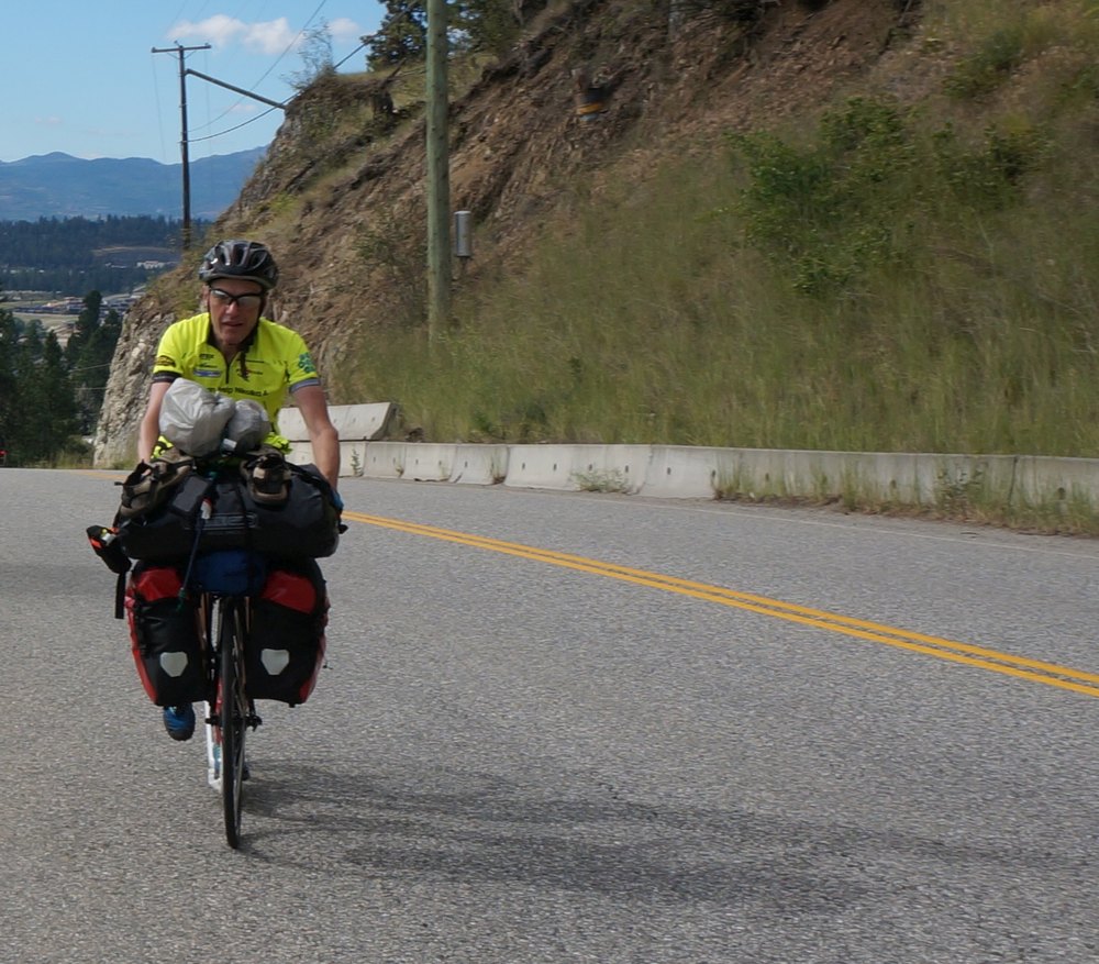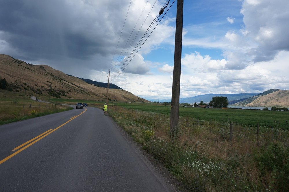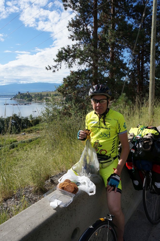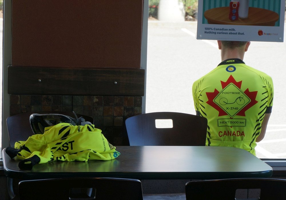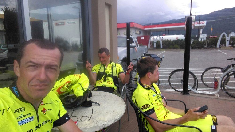 Dem Okanagan Lake sagten wir nun Lebewohl, wieder ging es bergauf, zuerst mit Rückenwind, dann aber mussten wir wieder einmal auf die Autobahn und in die Gegenrichtung. Das heißt, wir hatten Gegenwind und wir hatten die schwarzen Wolken vor uns. An Bergen in der Ferne erkannte ich, dass es dort ganz gewaltig schütten musste. Als Naturbursche kennt man das und weiß die fahnenartigen schwarzen Schleier am Himmel zu deuten. Nach einer flotten Abfahrt bogen wir ab und fanden Zuflucht in einem Mc Donald’s. Hier konsumiert Josef nie etwas. Ihm ging es nur ums WLAN und um ein Quartier für die Nacht zu checken. Frederic und ich trieben es arg und tranken Cola.