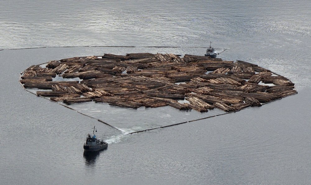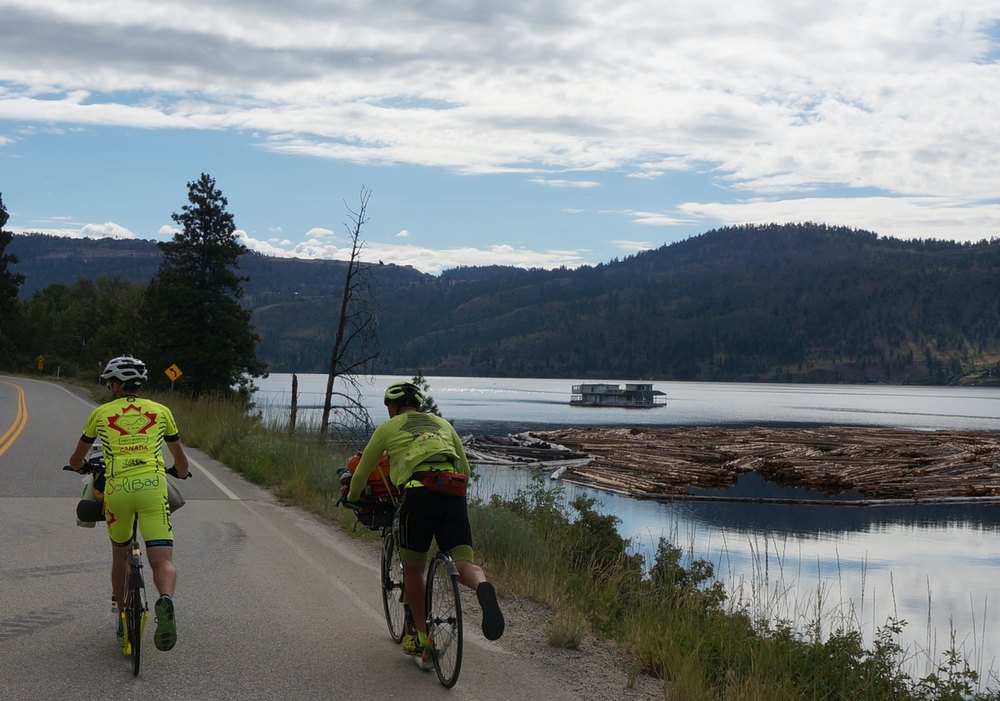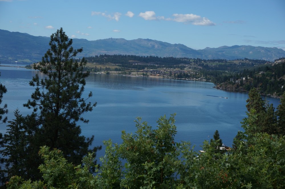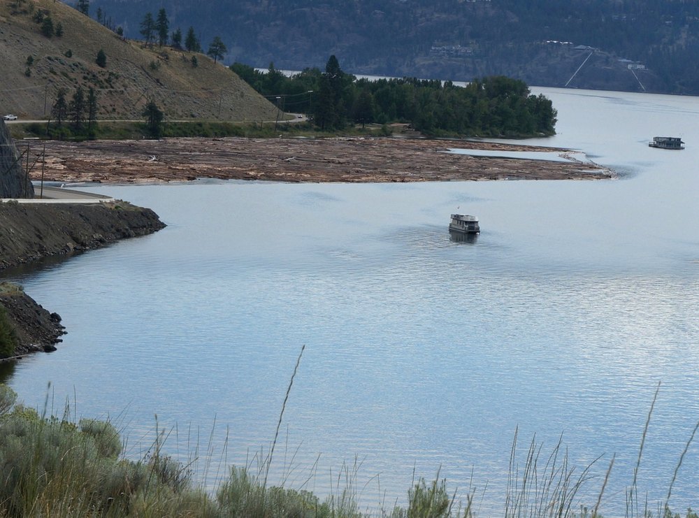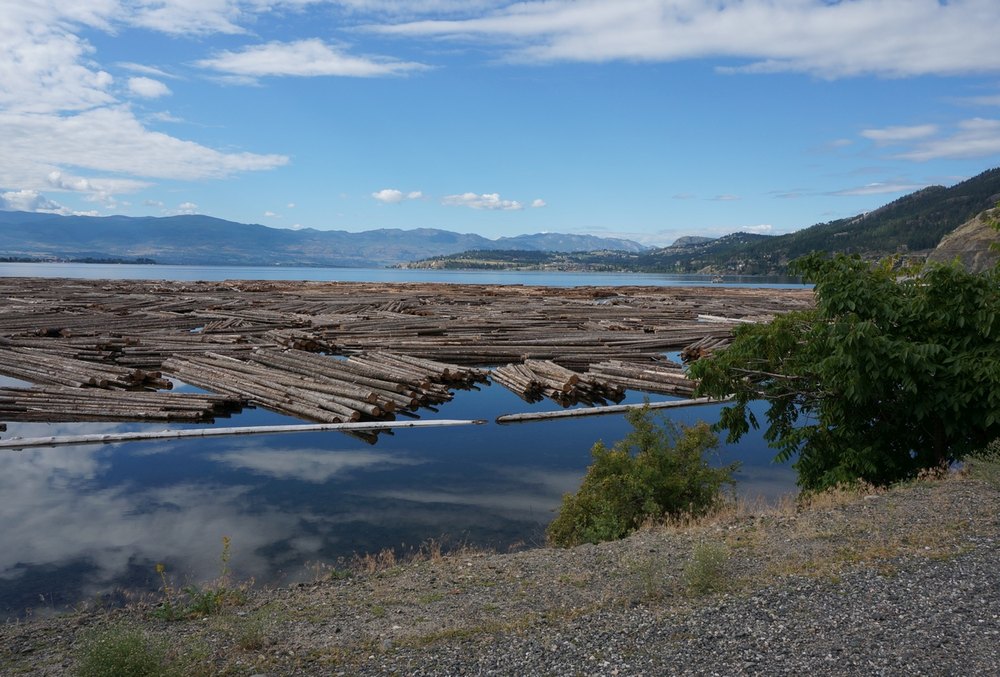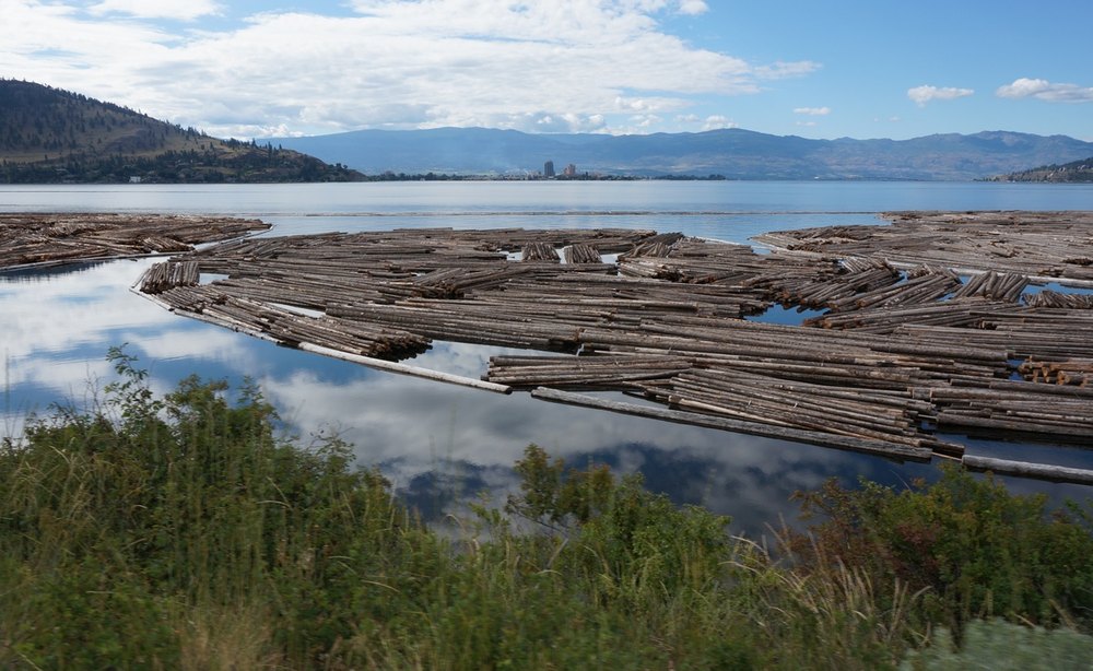 Jetzt aber zum Tag. Wir blieben noch viele Stunden am Okanagan Lake. Interessant, dass man in Kanada „Lake“ hinter den Namen schreibt, in den USA jedoch davor, wenn ich an den Lake Michigan denke. Oder ich täusche mich und kenne einfach zu wenig von der Welt. Von West Kelowna ging es lange leicht bergab bis Kelowna, immer Autobahn. Dann aber führte uns Josef sehr abenteuerlich von der Autobahn runter, einmal links, dann rechts, dann irgendwo unten durch und schon waren wir auf einer Landstraße. Der Bursche hatte sich echt etwas überlegt bei der Planung unserer Route! Wir fuhren entlang des Westufers bis ans Ende dieses sehr langen Sees. Gleich zu Beginn offenbarte sich nach einer undurchsichtigen Kurve das wofür Kanad bekannt ist, nämlich Holz und zwar Riesenholzstämme, die im Seewasser gelagert waren und auch mit einem Boot gezogen wurden. Dies alles war sehr neu für uns und Sonne und Wolken tauchten die Landschaft in abenteuerlich bunte Farben. Somit blieben wir immer wieder stehen um zu fotografieren.