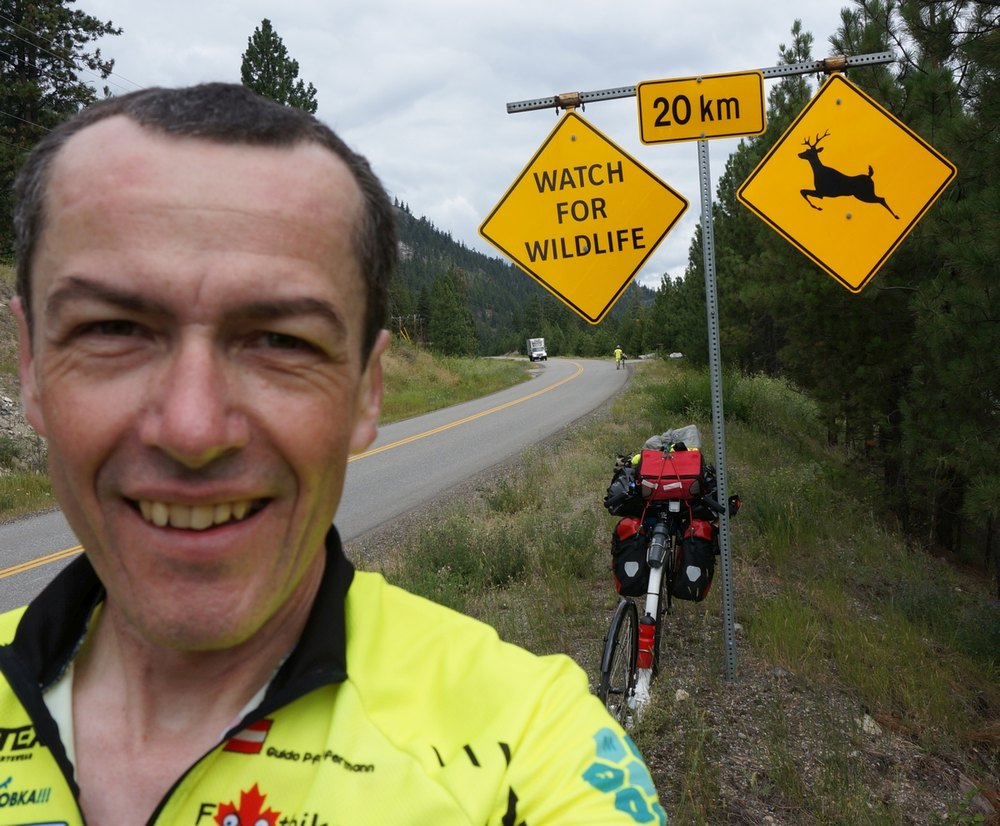 Warntafeln gab es betreffend frei laufenden Wilds. Auch das mussten wir fotografieren und insgeheim hofften wir, bald Elche oder zumindest Langhornziegen zu sehen. Leise genug wären wir ja um uns ihnen unauffällig zu nähern. Nicht so leise waren allerdings die Autos in beide Richtungen, mehrheitlich Pick Ups und gerne mit Motorbooten hinten dran oder Camping-Aufsätzen. Wir sahen den ganzen Tag kein wildes Tier.