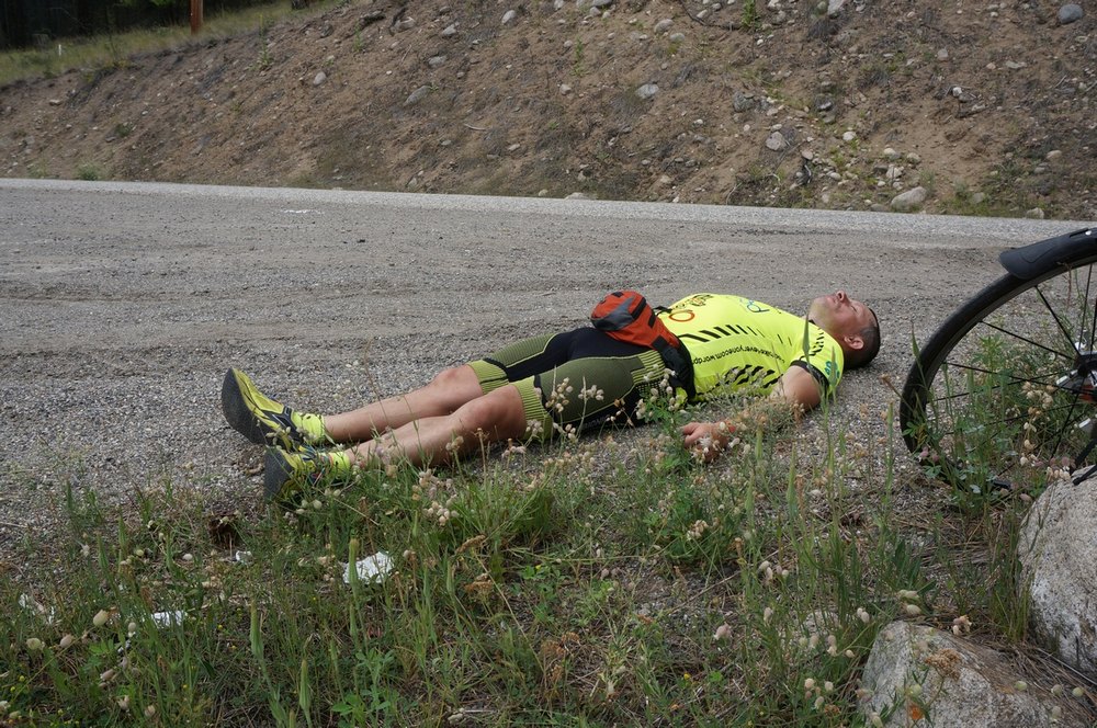 Endlich Pause. Wir saßen auf großen Steinen und warfen Essen und Trinken ein. Frederic kam auch bald. Er war ziemlich geschafft. So legte er sich einfach hin für viele Minuten und machte gar nichts. Klar, er kommt aus Paris und kennt keine Berge. Gestern meinte ich einmal, dass wir nach dem nächsten „hill“ eine Pause machen würde. Er war dann ganz entsetzt wie lange es zur Pause dauerte. Es sei dieser „ill“ ein „mountain“ gewesen. Für einen Pariser sei jeder Mugel schon ein Berg. Nun blieben wir hier mindestens 20 Minuten. Ich cremte mich zum Zweitenmal mit Sonnenschutz ein. Heute fuhr ich erstmals auch mit kurzer Hose. Das war gut so. Ursprünglich dachte ich, an den Fotos, die so Tag für Tag gemacht werden, erkenne man den Lauf der Zeit an meiner Haarlänge. Seit heute weiß ich, dass der Schwärzungsgrad meiner Haut eine viel deutlichere Sprache spricht. An den Armen und im Gesicht habe ich jetzt schon eine recht gesunde Farbe, dabei war es doch sehr oft bewölkt.