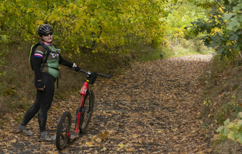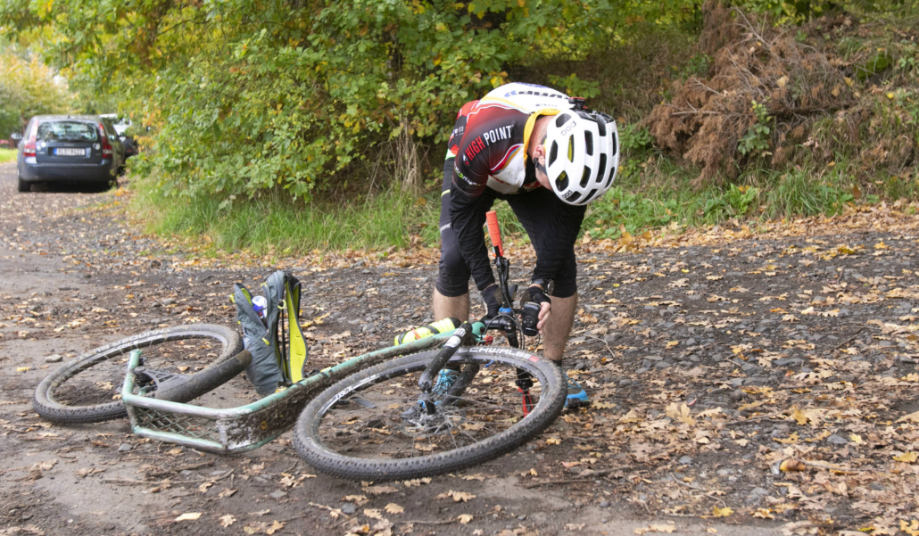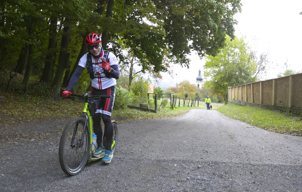 Obwohl es eine Crossrollerveranstaltung ist, wollte uns Mira in dieser zweiten Ausgabe des Rennens auch die Städte zeigen. So fuhren wir am Freitag am Südufer der Elbe durch Ústí nad Labem, um die inzwischen berühmte „Konditions-Trainings-Strecke Jiskra Bruk“ von der Burg Střekov bis zur Tafel bei Němčí als eigene Bergwertung zu erklimmen: 7,364 km / 487 hm. Danach führte die Strecke, über Stock und Stein, ein wenig Asphalt, aber vor allem über schlammige Trails und Waldwege mit Steinen, Pfützen und Laub, nach Süden. Kurz vor Litoměřice ereignete sich leider ein folgenschwerer Sturz des bis dahin souverän führenden Vašek Obrtlík: In einer Abfahrt stürzte er über den Lenker und verletzte sich so schwer am Knie, dass er nicht weiterfahren konnte und aus dem Rennen aussteigen musste. Glücklicherweise ist er inzwischen aber schon auf dem Weg der Besserung.