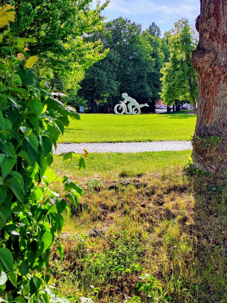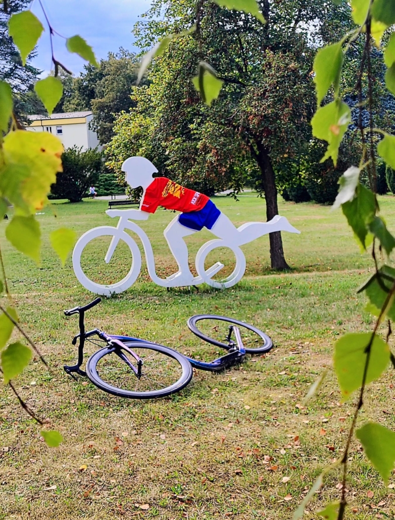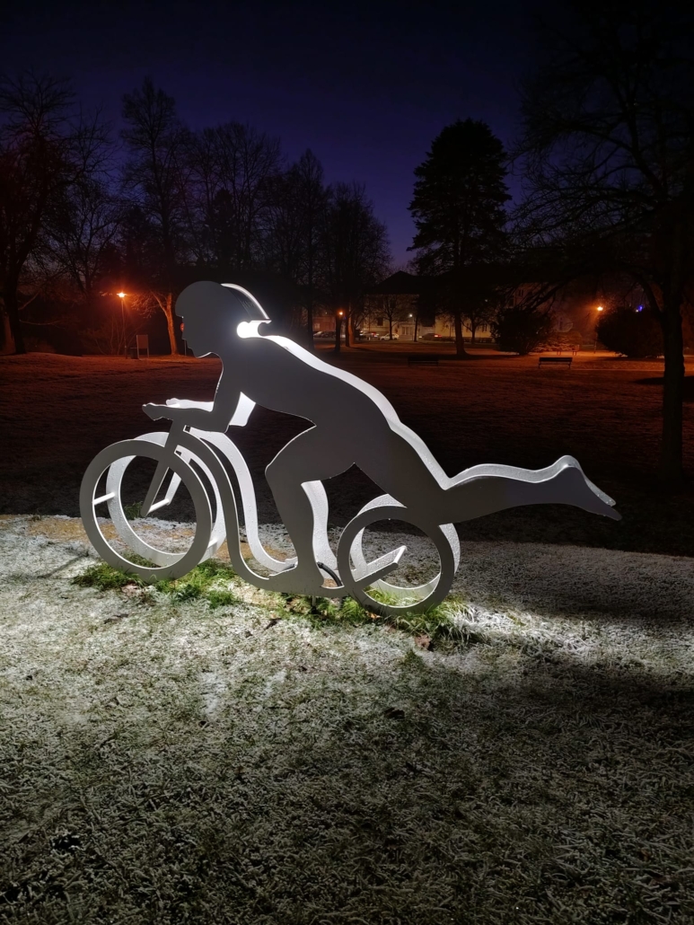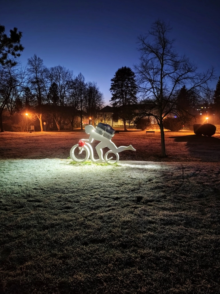 Meist strahlt die Metallskulptur in Weiß, doch Roman Šimon dekoriert die Installation anlassbezogen, beispielsweise zu Weihnachten oder zu wichtigen Aktionen des Tretrollersports wie dem grandiosen „Kick Spain 2025“.